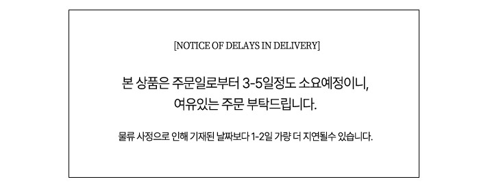 -입금 확인 후 재고물량 확보시 공휴일 제외 1~4일 소요되며, 재주문시에는 공휴일 제외 3~7일 이상 지연 될 수 있습니다. 주문건중 일부 상품 먼저 준비될경우 부분발송 드립니다 |