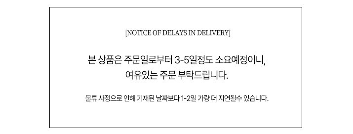 -입금 확인 후 재고물량 확보시 공휴일 제외 1~4일 소요되며, 재주문시에는 공휴일 제외 3~7일 이상 지연 될 수 있습니다. 주문건중 일부 상품 먼저 준비될경우 부분발송 드립니다 |